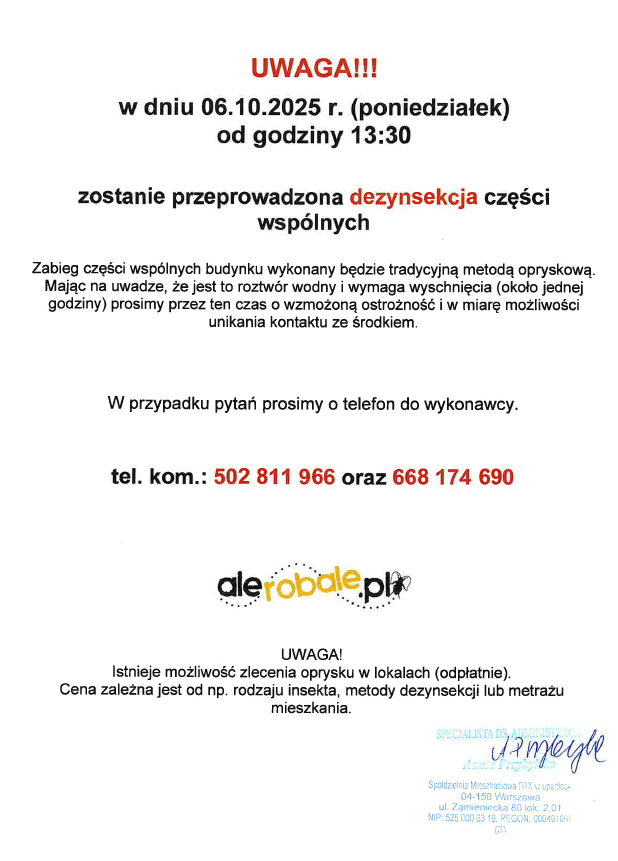 w dniu 06.10.2025 r. (poniedziałek) od godz. 13:00 zostanie przeprowadzona dezynsekcja części wspólnych nieruchomości.