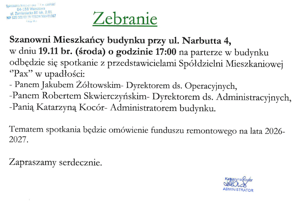 ul. Narbutta 4 – spotkanie w dniu 19.11.2025 r. godz. 17:00 – informacja