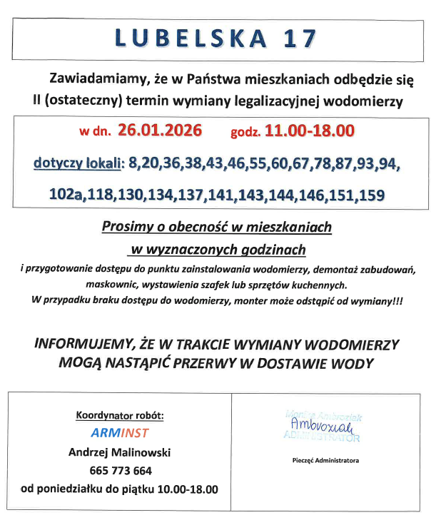 ul. Lubelska 17 – wymiana wodomierzy (II termin) – informacja