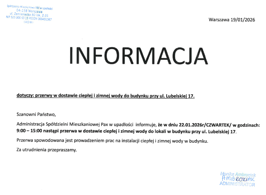 • ul. Lubelska 17 – brak wody (22.01.2026 r., godz. 9:00 – 15:00) – informacja