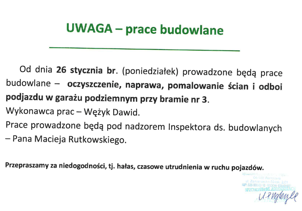 Al. Stanów Zjednoczonych 72 – remont zjazdu – garaż nr 3 – informacja przez admin o 23/01/2026 w Informacje, Styczeń 2026 Poprzedni ul. Rzymowskiego 19 – prace hydrauliczne – informacja Następne Al. Stanów Zjednoczonych 72 – brak ciepłej wody – 29.01.2026 r. – informacja