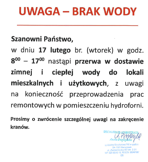 Al. Stanów Zjednoczonych 72 – brak zimnej i ciepłej wody 17.02.2026 r. – informacja przez admin o 13/02/2026 w Informacje, Luty 2026 Poprzedni ul. Zamoyskiego 47, 47A, 45, 45A – przerwa w dostawie wody – informacja Następne Os. Modzelewskiego – odbiór przepustek – informacja