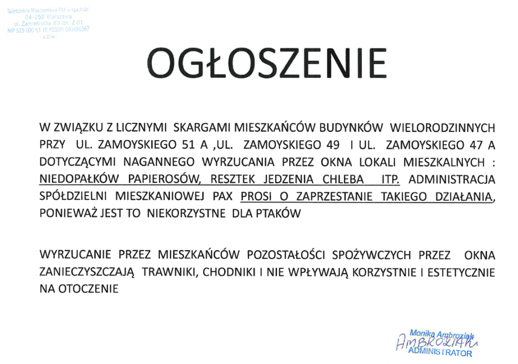 ul. Zamoyskiego 51A, 49, 47A – naganne wyrzucanie przez okna – informacja