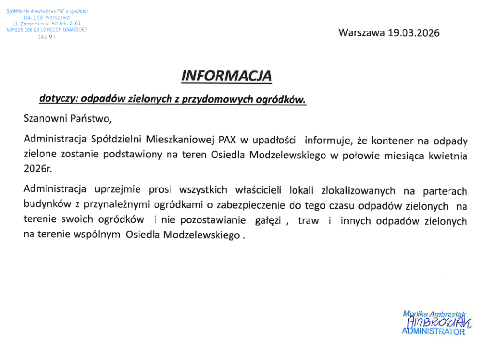 Os. Modzelewskiego – odpady zielone z przydomowych ogródków – informacja przez admin o 19/03/2026 w Informacje, Marzec 2026 Poprzedni ul. Zamoyskiego 49 – naprawa balkonów oraz naprawa elewacji – zapytania ofertowe