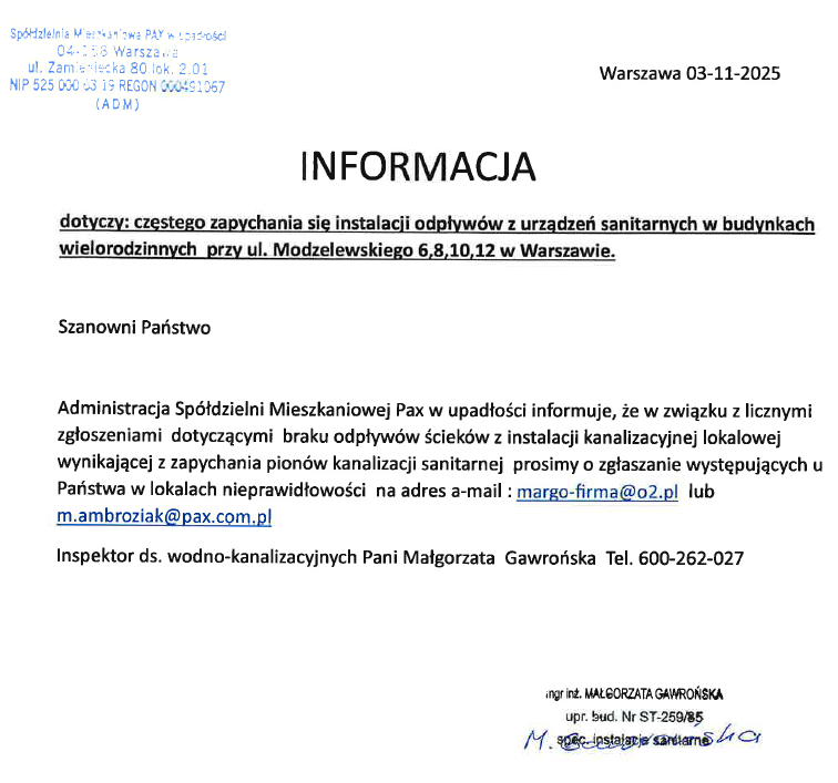 Wszystkich mieszkańców ww. nieruchomości prosimy o zapoznanie się z dokumentem.